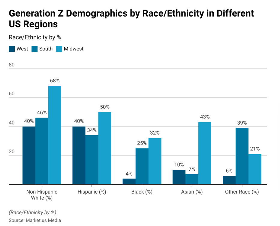 - Generation Z is racially diverse, while that diversity uniquely spreads across regions. (Market.us Media, 2026)