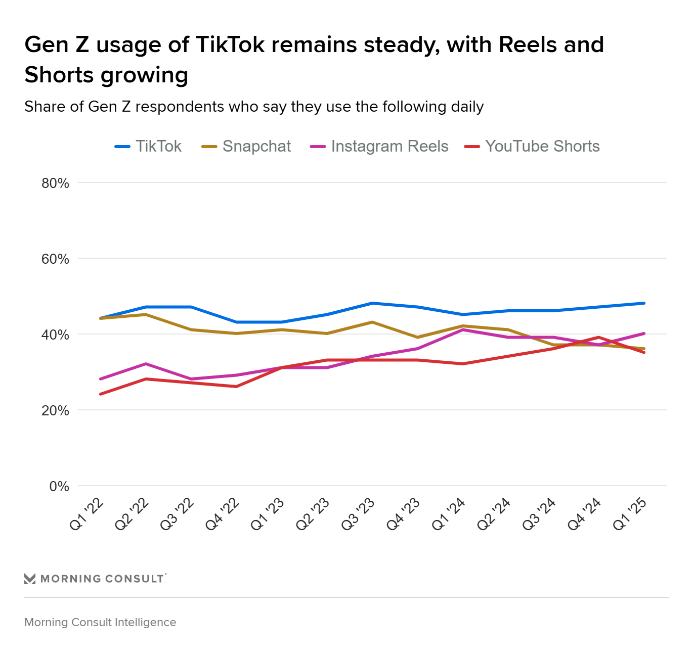 - With TikTok in the lead, the race for #2 remains tight as Reels and Shorts continue drawing users (Morning Consult, 2025)