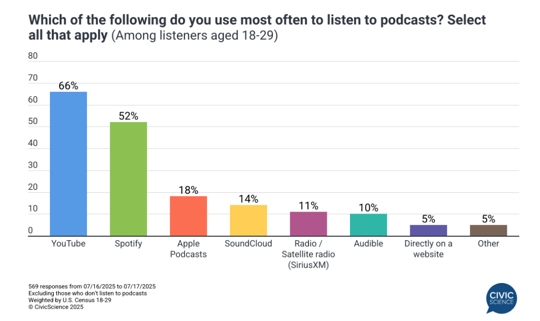 - YouTube and Spotify are the frontrunners when it comes to where Gen Z listens to their podcasts. (Civic Science, 2025)