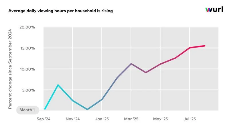 - The number of “monthly active households” using free ad-supported streaming TV services was up 12% YoY as of August, while the average daily FAST viewing hours per household climbed 16% YoY. (Wurl CTV Trends Report, 2025)