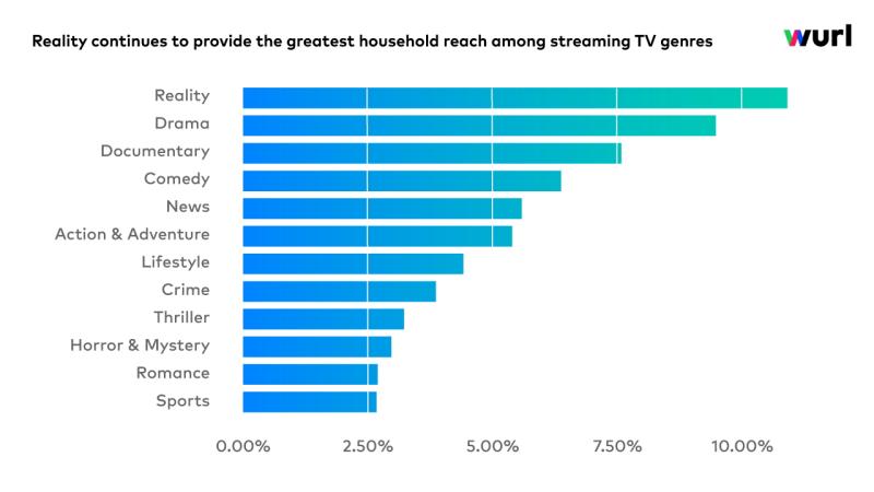- Among programming genres, reality programming garners the biggest share of FAST viewing time, consuming nearly 11% of aggregate usage. (Wurl CTV Trends Report, 2025)