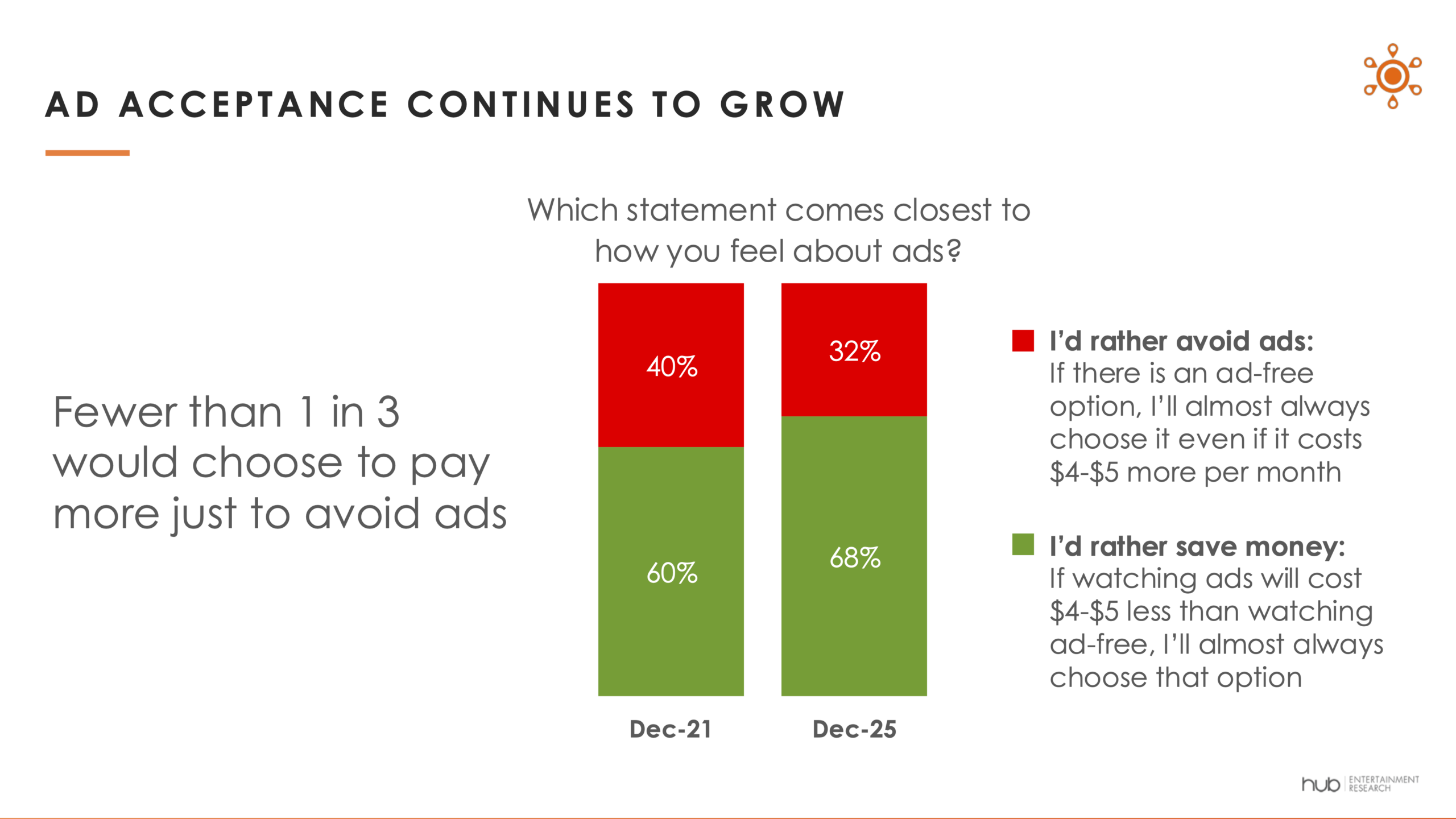- Two‑thirds (68%) of viewers in December 2025 would “rather save money” with ads than pay more to avoid them — a significant rise since 2021. (Hub Entertainment Research, TV Advertising: Fact vs. Fiction, 2025)